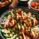 A comforting and flavorful Bang Bang Chicken Bowl featuring tender chicken, fluffy jasmine rice, fresh vegetables, and a creamy spicy mayo.