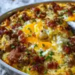 A comforting breakfast casserole with layers of hash browns, eggs, cheese, and bacon, perfect for busy mornings or special occasions.