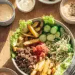 Once everything is beautifully cooked, it’s time for the fun part! Take each bowl and divide the crispy potato chips into them. Fill the remaining space with shredded lettuce, then neatly pile the cooked beef on top. Add generously with cheese and a few pickle slices. Finally, drizzle that creamy burger sauce over the entire bowl and get ready for smiles all around!