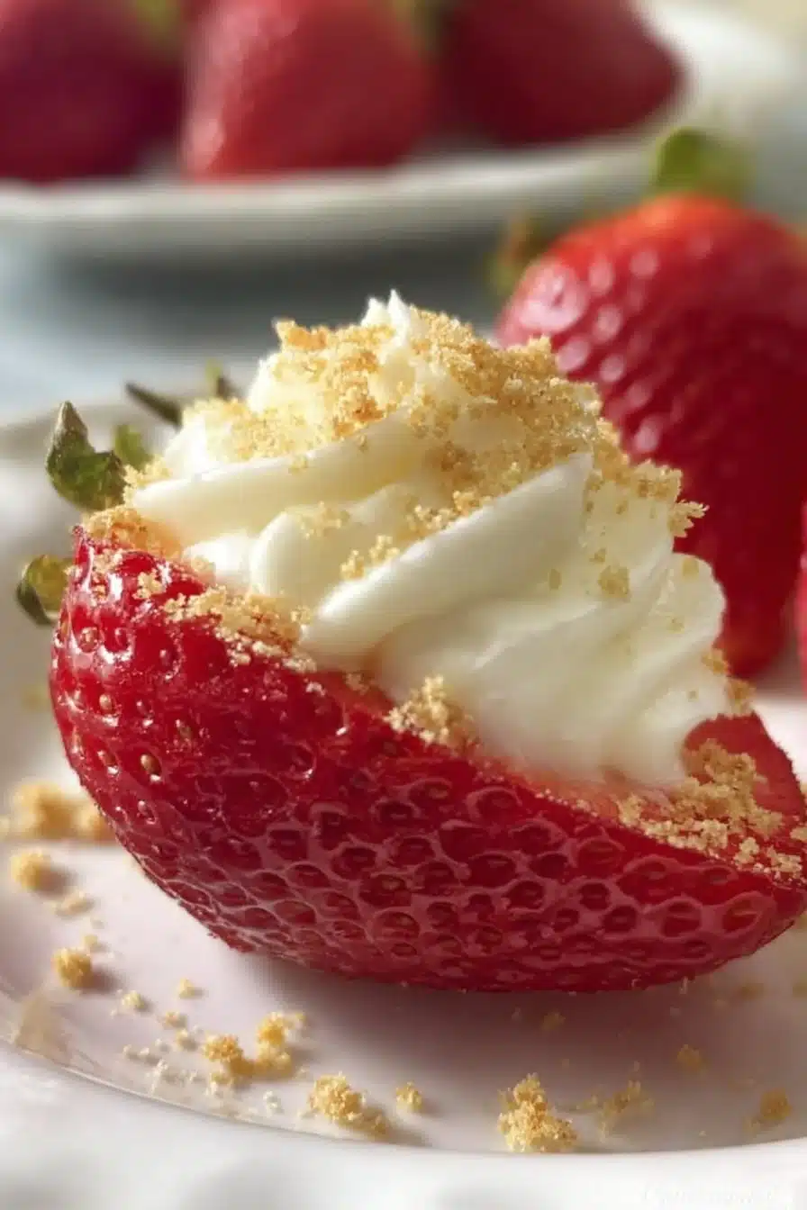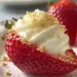 A delightful dessert featuring strawberries hollowed out and filled with a rich, creamy cheesecake-like filling.