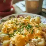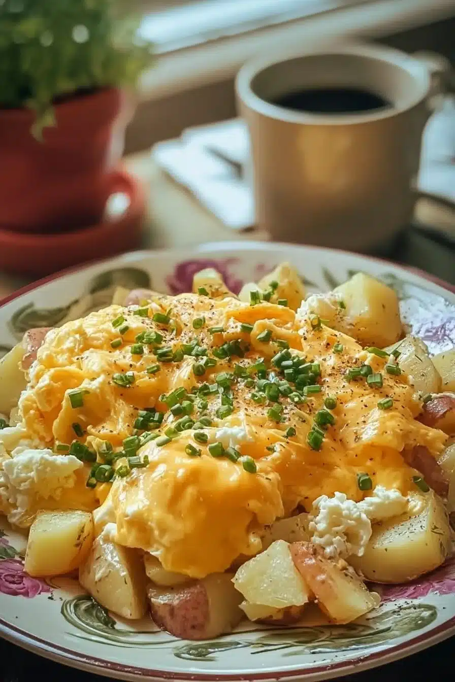 A warm and comforting cheesy potato egg scramble perfect for breakfast or brunch, blending golden potatoes with fluffy scrambled eggs and gooey cheddar cheese.