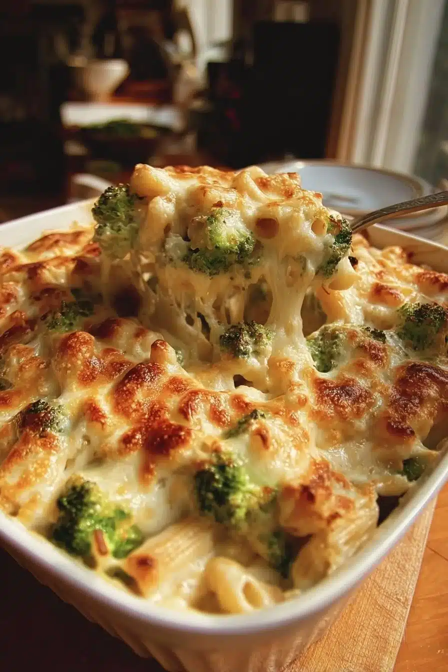 A comforting Chicken and Broccoli Alfredo Bake filled with tender chicken, fresh broccoli, creamy Alfredo sauce, and pasta, perfect for family dinners.