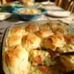 A comforting and creamy Chicken Pot Pie topped with fluffy biscuits, perfect for cozy evenings.