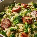 A warm, comforting dish featuring tender orzo, al dente broccoli, and savory chicken sausage, perfect for cozy family dinners.