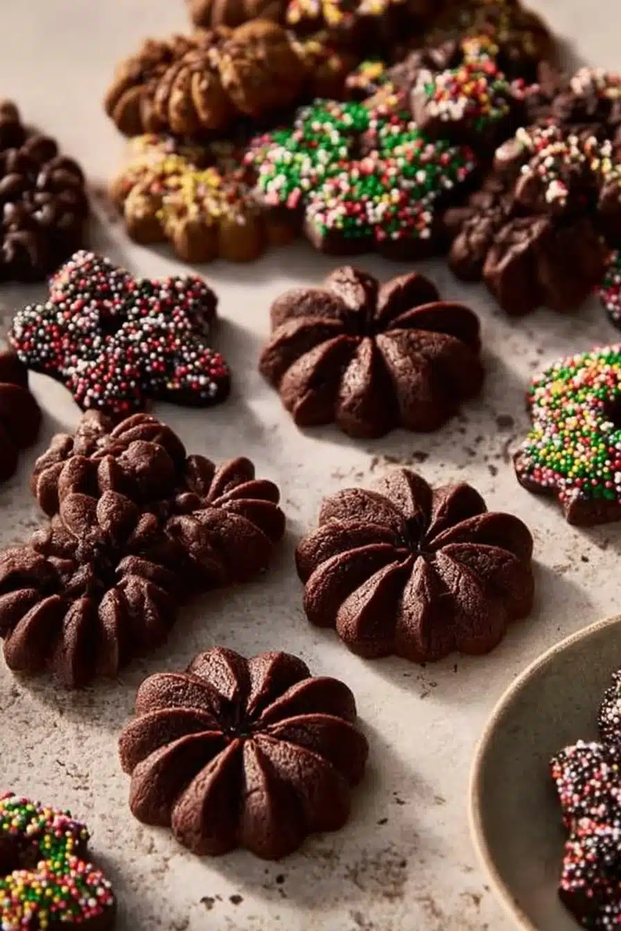 These Easy Chocolate Spritz Cookies are perfect for so many reasons. First and foremost, they are rich, chocolatey, and offer a delightful melt-in-your-mouth texture that will remind you of all the best cookie moments. The vibrant sprinkles on top add a playful pop of color, making them not only delicious but a feast for the eyes, too! Plus, making these cookies is a wonderful way to bond with your family. Kids can join in on the fun by using a cookie press to create their favorite shapes, turning baking into an enjoyable creative experience.