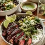 - Assemble Bowls: Layer rice, beans, corn, sliced steak, cherry tomatoes, avocado, red onion, and cheese (if using) in bowls. Garnish with extra cilantro and lime wedges.