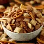 A crunchy, sweet, and slightly salty snack that combines Chex cereal, mini pretzels, and gooey caramel, sprinkled with aromatic cinnamon sugar.