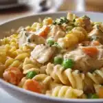 A comforting pasta dish that captures the essence of chicken pot pie, featuring creamy sauce, tender chicken, and mixed vegetables.