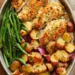 A comforting and easy sheet pan dinner featuring crispy Parmesan crusted chicken, tender roasted potatoes, and vibrant green beans.