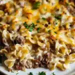 Now it’s time for the fun part! In a large mixing bowl, combine the cooked egg noodles with the savory beef mixture. Gently fold them together, ensuring every noodle is coated with the creamy goodness. Transfer this delightful mixture into a greased 9×13-inch baking dish. Sprinkle the shredded cheddar cheese generously on top, feeling free to add more if you’re looking for that extra melty goodness.