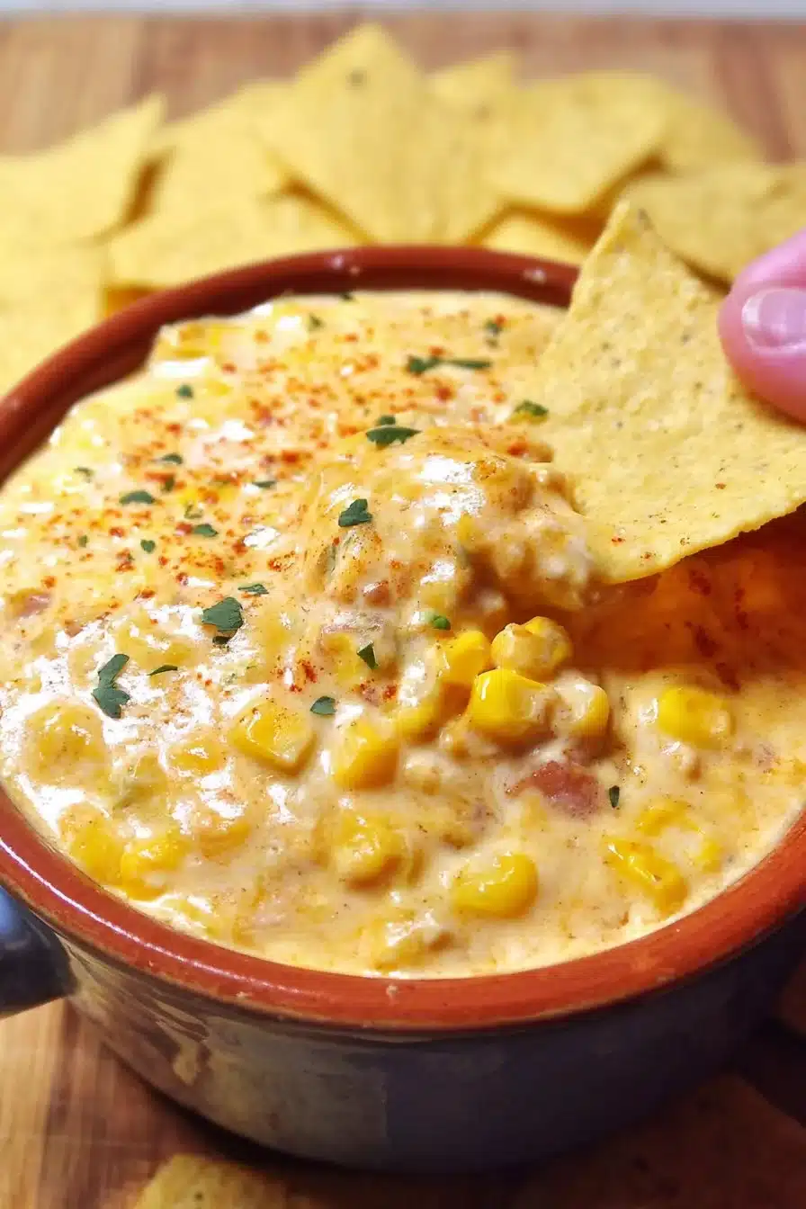 Serve your warm corn dip with a bowl of crunchy tortilla chips on the side. You can also consider offering fresh veggies, like carrot sticks or bell pepper strips, for a healthier option. This dip is perfect for scooping!