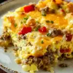 A comforting and hearty breakfast casserole filled with eggs, sausage, and cheese, perfect for family gatherings.