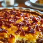 In a separate bowl, whisk together the eggs until fluffy. This adds an airy quality to the filling. Pour in the heavy cream and half of the shredded cheddar cheese, then gently fold to combine. The mixture should be rich and inviting; don’t worry if it looks a little lumpy—those will melt beautifully during baking. Carefully pour this creamy goodness over the beef layer, ensuring it covers evenly. Sprinkle the remaining cheddar cheese and the rest of the bacon on top to create a golden crust that will have everyone clamoring for seconds.