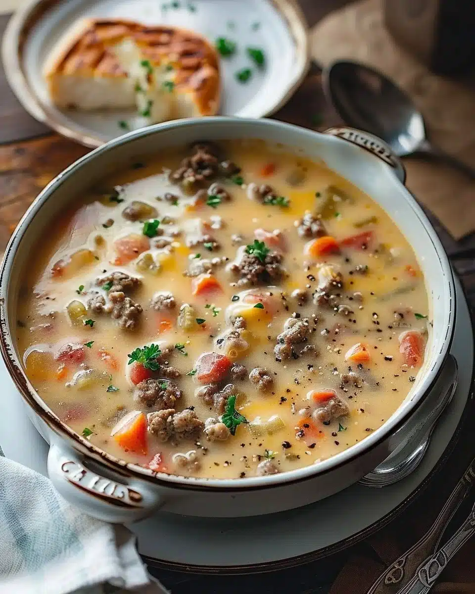 A comforting and creamy cheeseburger soup perfect for chilly evenings, combining hearty vegetables, ground beef, and melted cheese.