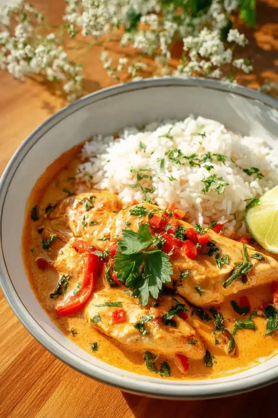 To serve, place a generous scoop of rice onto each plate, top it with the chicken and curry, and sprinkle fresh cilantro on top. Perhaps a little extra lime or red pepper flakes for those who like a kick? Enjoy this aromatic and satisfying meal!