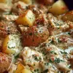 Garlic Parmesan Crockpot Chicken and Potatoes is an easy, set-it-and-forget-it meal with juicy chicken, tender potatoes, and rich garlic–Parmesan flavor—perfect for busy days.