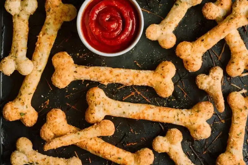 Spine-Chilling Cheesy Halloween Breadstick Bones with Marinara Blood for Dipping