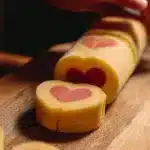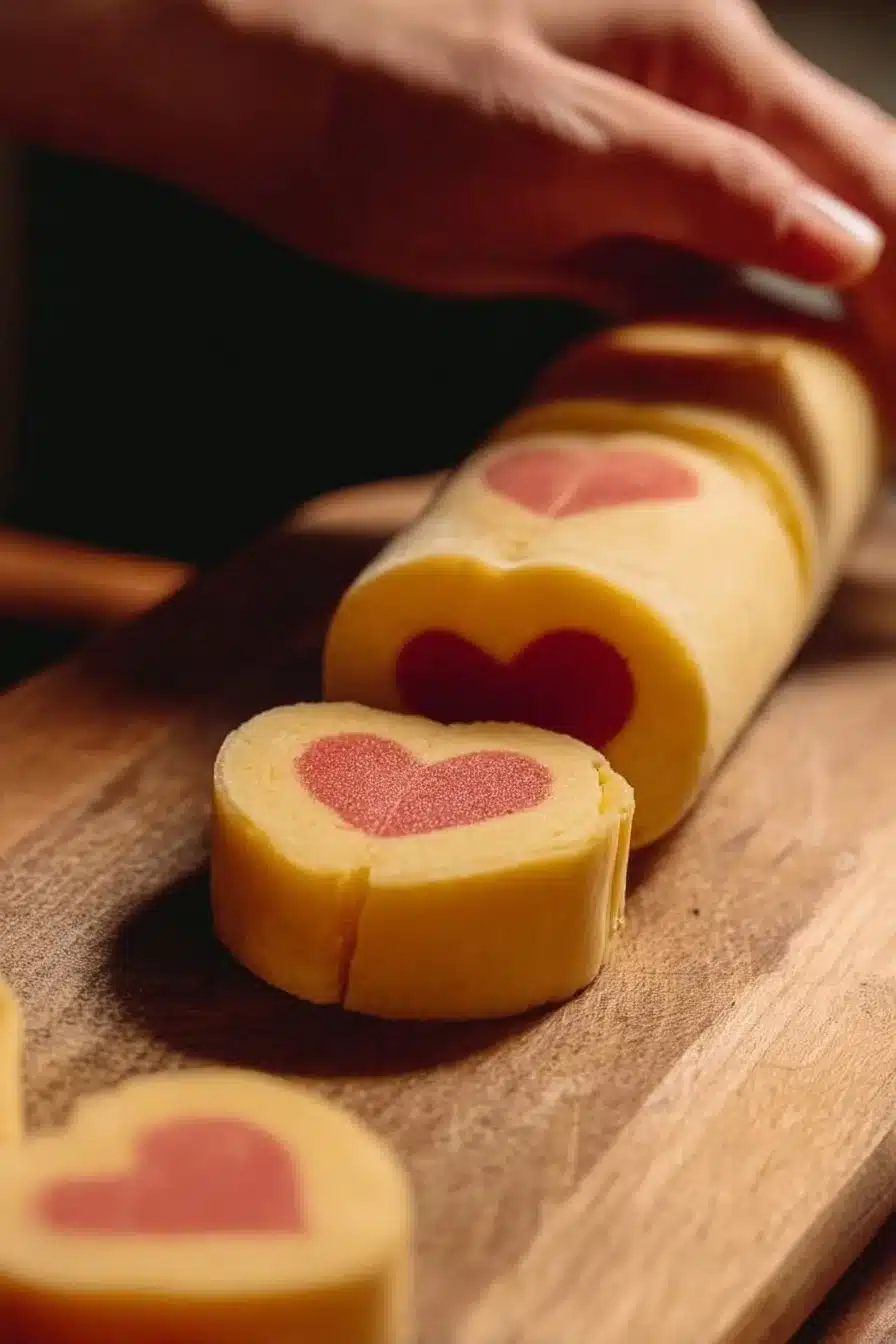When you’re ready to bake, preheat your oven to 350°F (175°C). Remove the chilled dough from the fridge and slice the logs into 1/4 inch thick pieces. Use a heart-shaped cookie cutter to stamp out those adorable shapes.