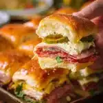 Cozy, flavorful sliders filled with meats, cheeses, and zesty peppers, perfect for gatherings.