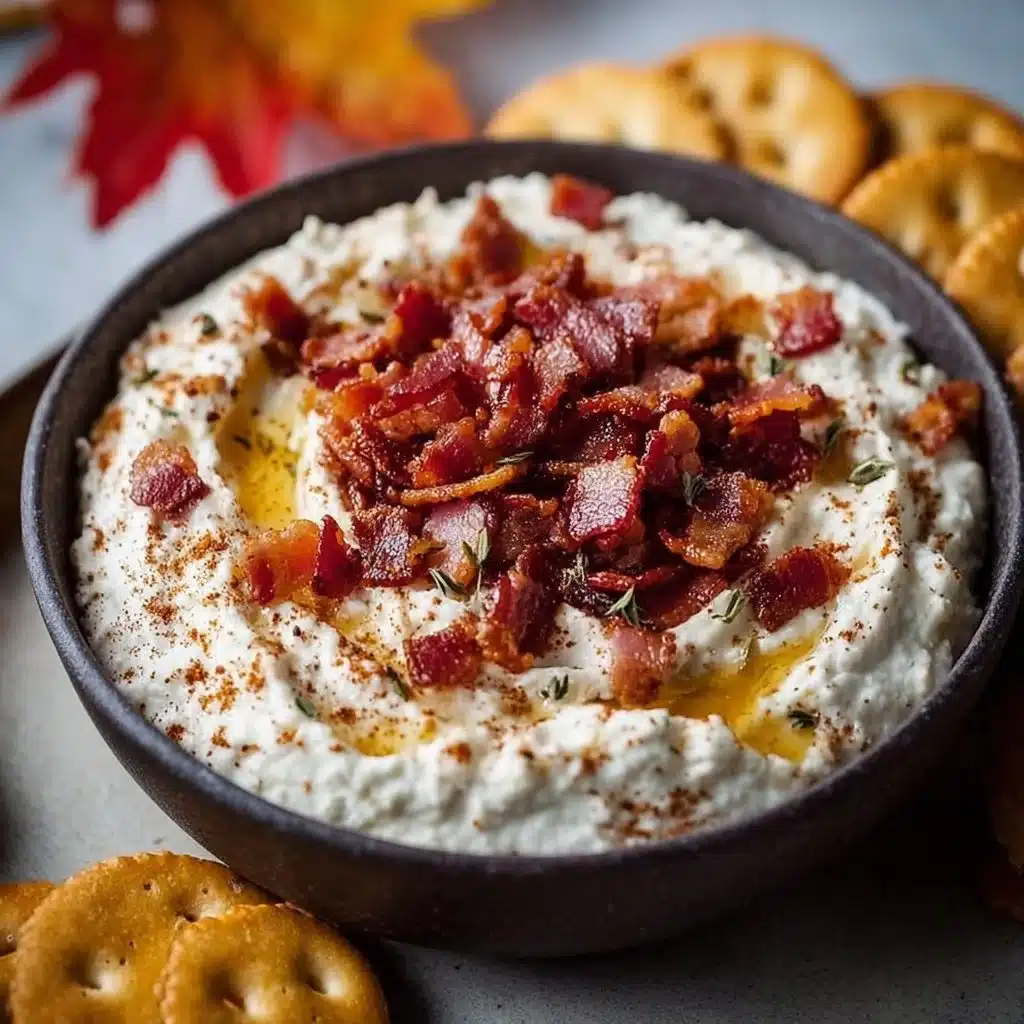 Delicious Maple Bacon Cheese Dip served in a bowl, garnished with crispy bacon.