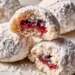 Delightful cookies with a buttery exterior and a fruity burst of raspberry jam in the center, rolled in powdered sugar for an elegant finish.