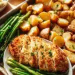A comforting sheet pan dinner featuring Parmesan crusted chicken with roasted potatoes and green beans, perfect for weeknight meals.