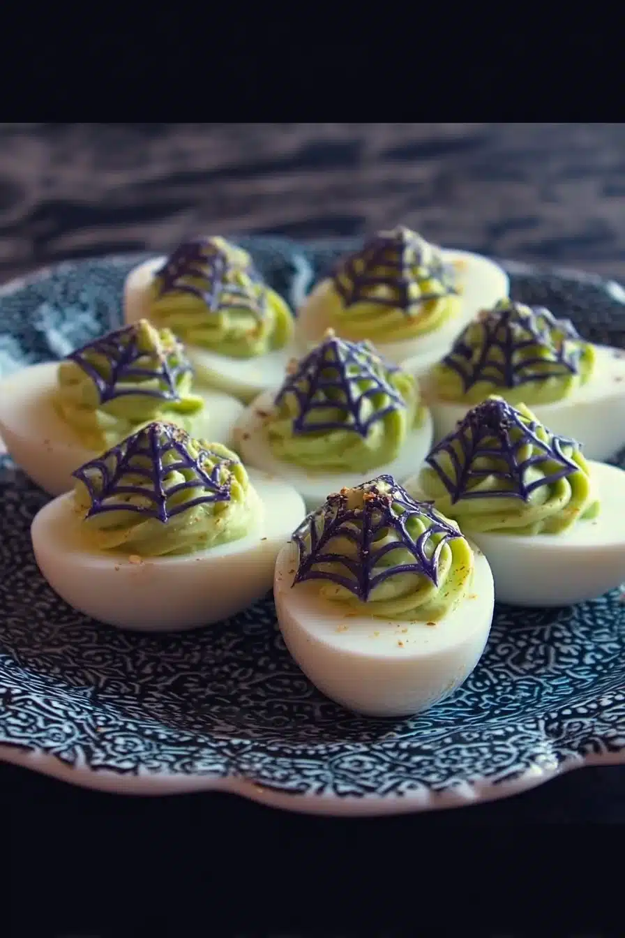 Spooky Spiderweb Deviled Eggs decorated with spiderweb patterns for Halloween