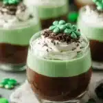 Delightful layered pudding cups featuring chocolate and mint-flavored vanilla pudding, topped with crunchy Oreo crumbs and whipped cream, perfect for St. Patrick’s Day celebrations.
