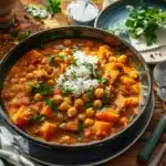 This curry is not just a meal; it’s a humble treasure. Made from wholesome ingredients like sweet potatoes and chickpeas, you’ll find it to be both nourishing and serene, a gentle hug for your stomach. The creamy coconut milk envelops every bite, while the vibrant spices—curry powder and cumin—bring a warmth that whispers of exotic lands, making it feel like a culinary escape without stepping out of your kitchen.