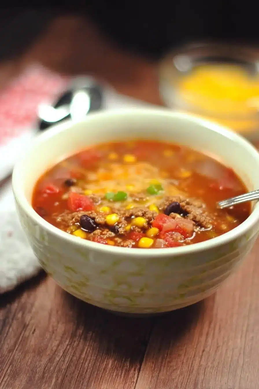 Keywords: taco soup, beef taco soup, easy soup recipe, weeknight dinner