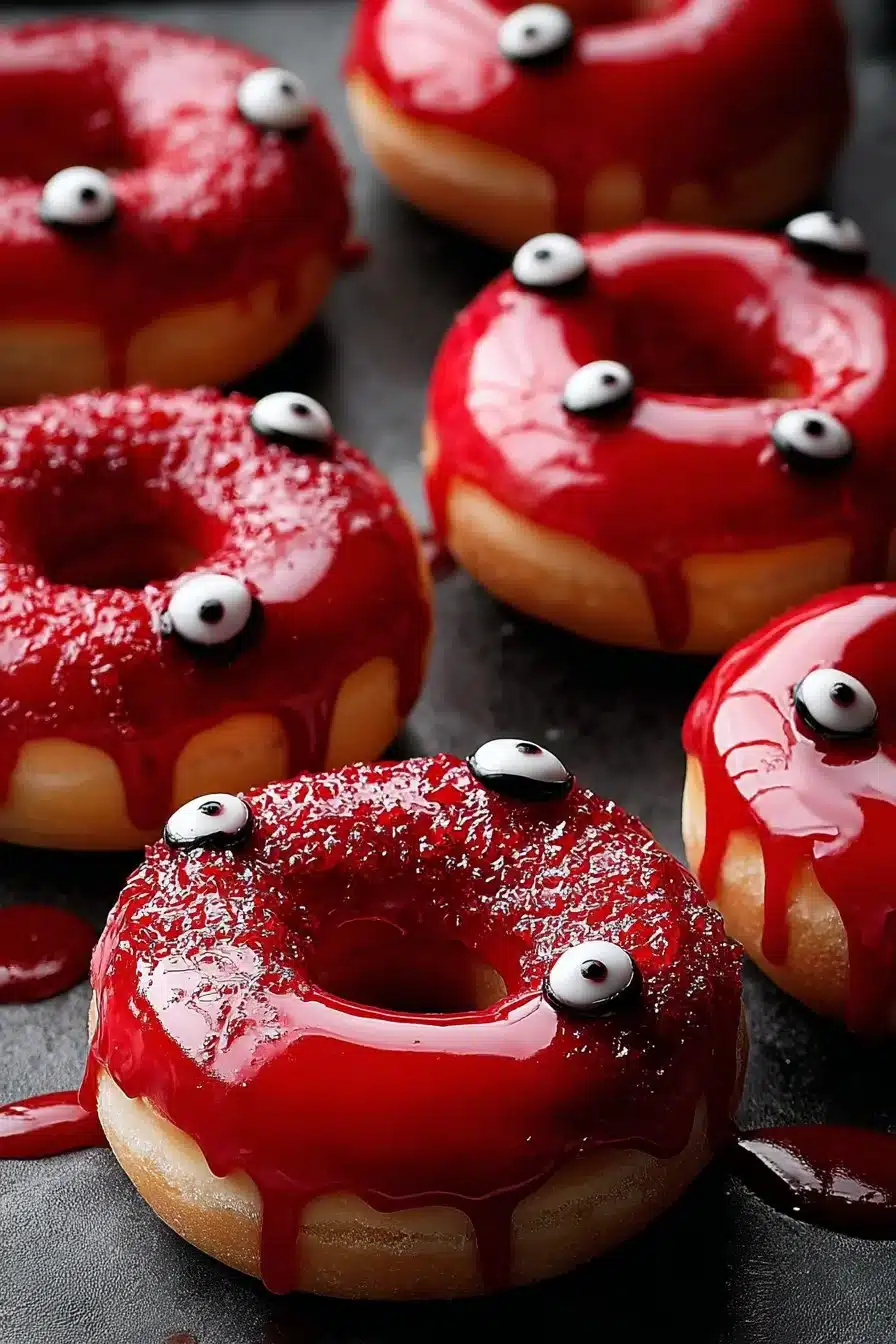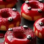 Vampire Donuts are a spooky Halloween dessert made with soft chocolate donuts, dipped in chocolate and red icing, and finished with edible eyes for a fun vampire look. Perfect for parties, family nights, or festive gatherings!